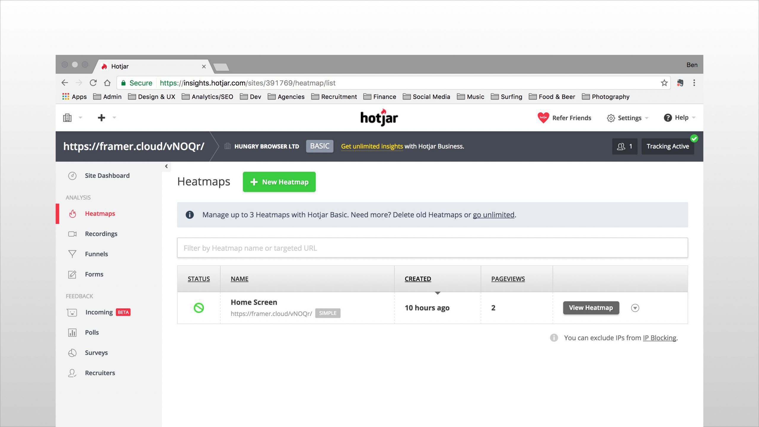Device heatmaps dashboard listing the individual heatmaps that have been set up for the prototype.