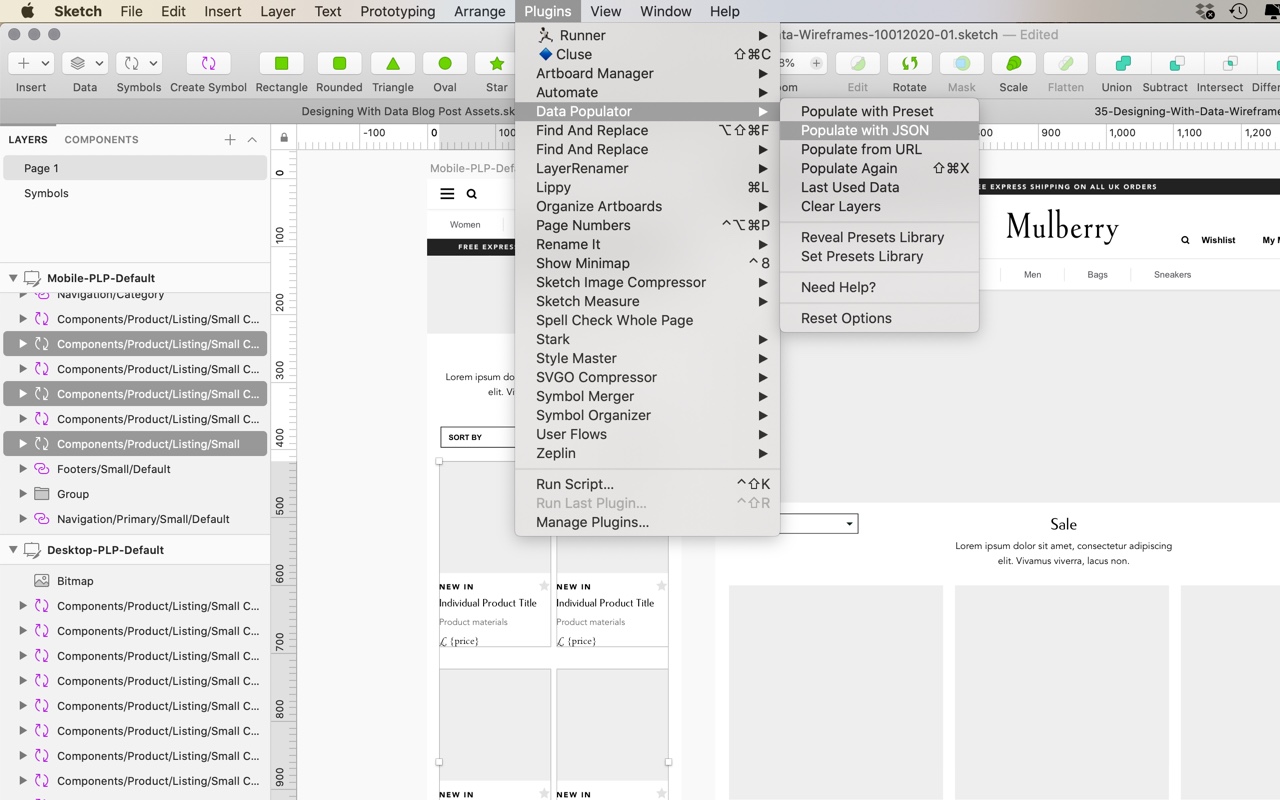 Screen shot of the Sketch App plugin menu with Data Populator selected.